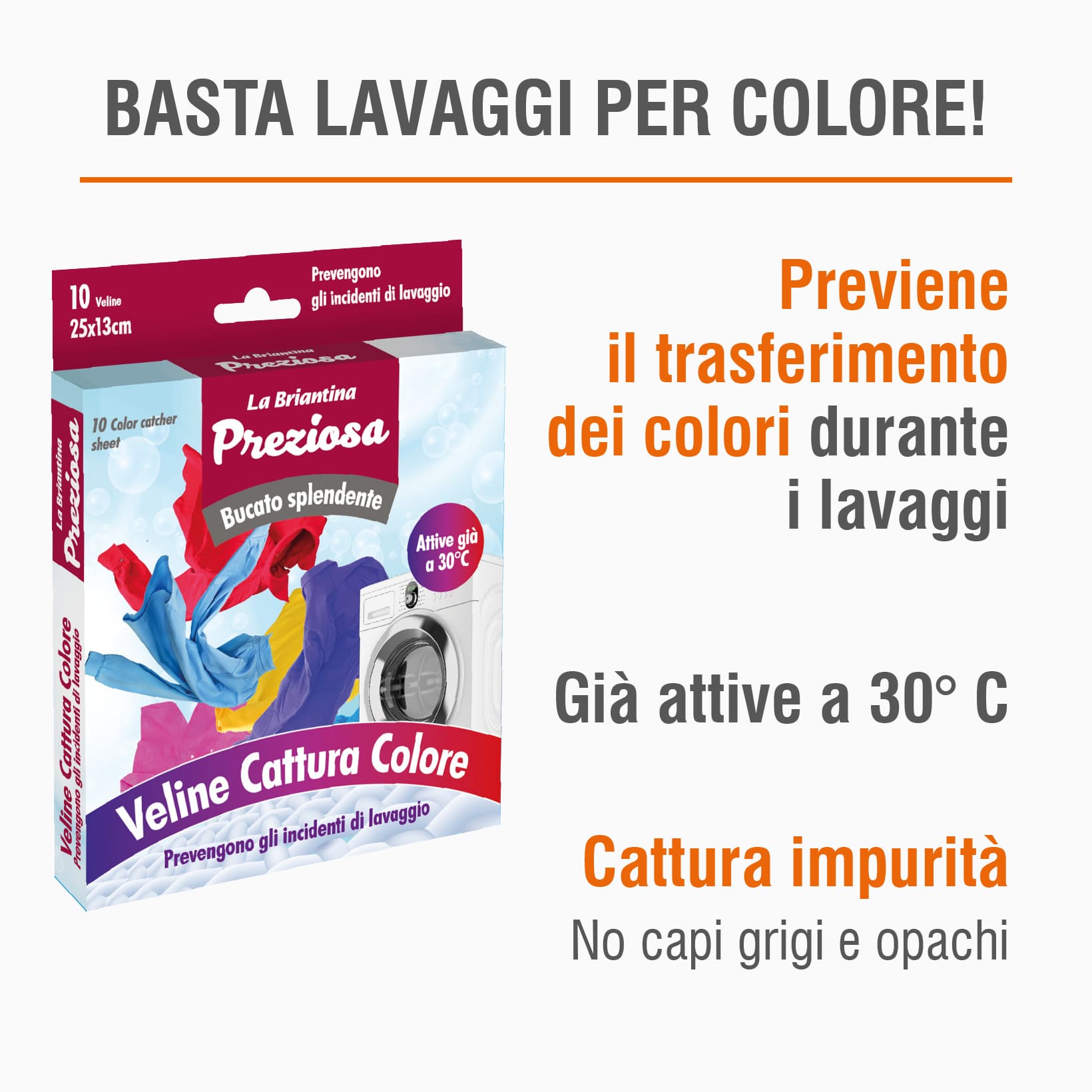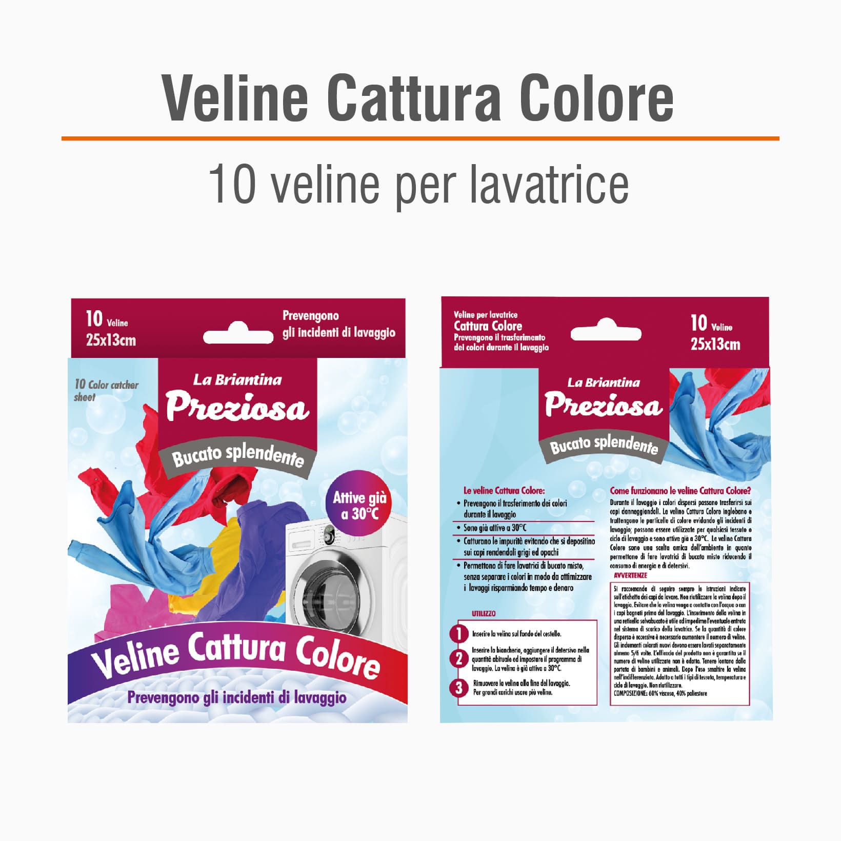 ULTERIORI AVVERTENZE PER VELINE CATTURA COLORE BUCATO PROTETTO 25X13CM 10PZ: Seguire sempre le istruzioni di lavaggio riportate sull’etichetta dei capi. I capi colorati nuovi devono essere lavati separatamente per le prime volte. In caso di tessuti che perdono molto colore (jeans, capi rossi o molto scuri) usare almeno 3 fogli. L’efficacia non è garantita in presenza di capi bianchi mescolati a colorati che stingono molto o in caso di eccesiva perdita di colore. Terminato il programma di lavaggio, stendere i capi ad asciugare il più presto possibile. Il prodotto non sostituisce l’azione dell’ammorbidente. Prodotto coadiuvante del lavaggio.