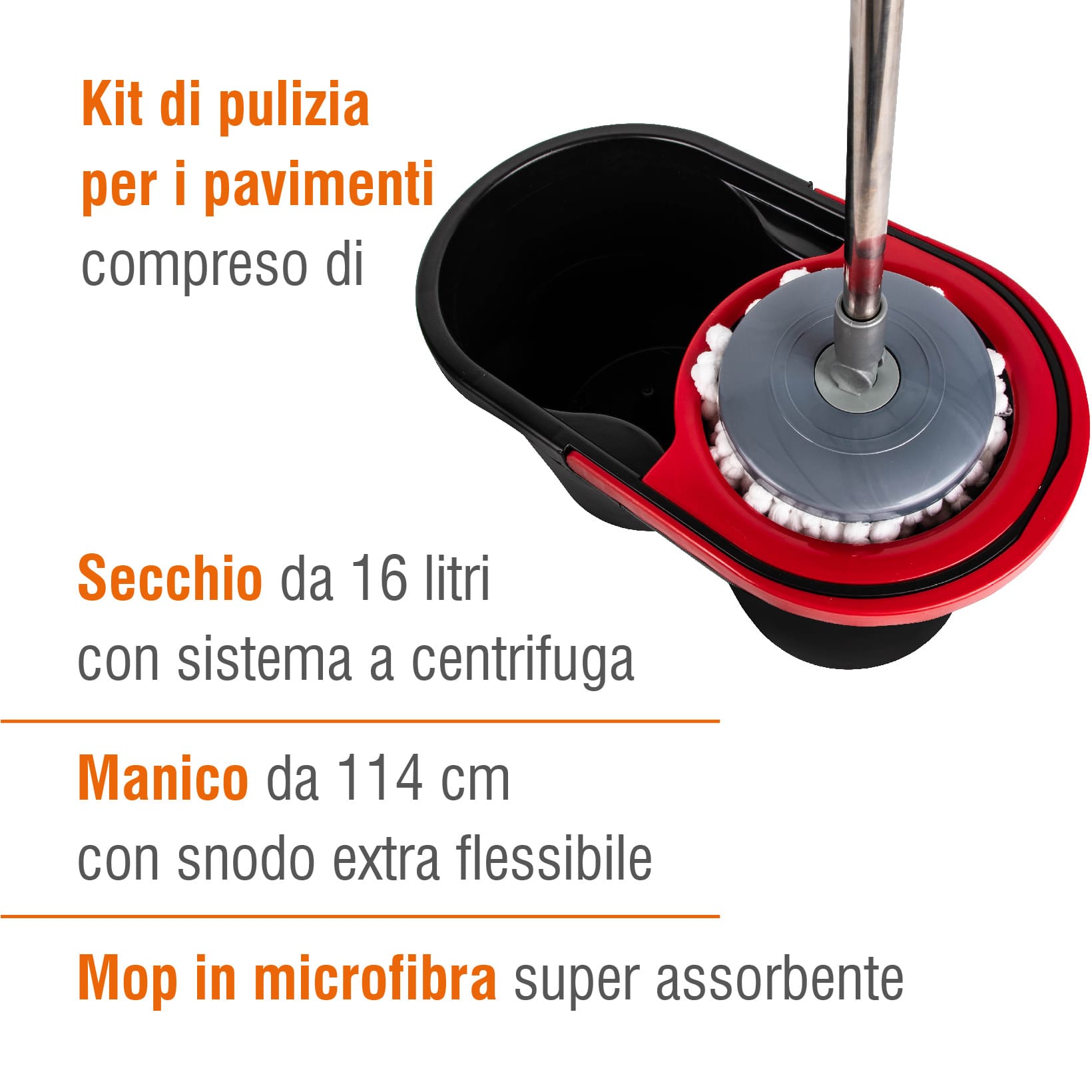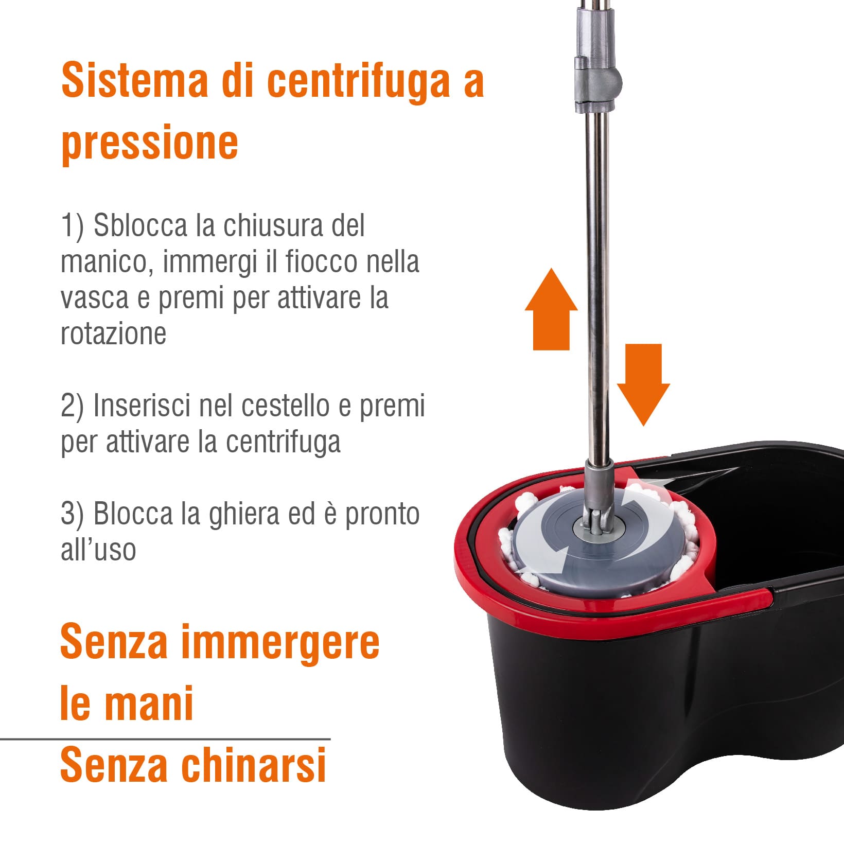 🟡 Il Mop con centrifuga a pressione permette di strizzare senza bagnarsi le mani. Le frange in microfibra assorbono efficacemente senza danneggiare le superfici, mentre lo snodo a 180° raggiunge facilmente gli angoli più nascosti.