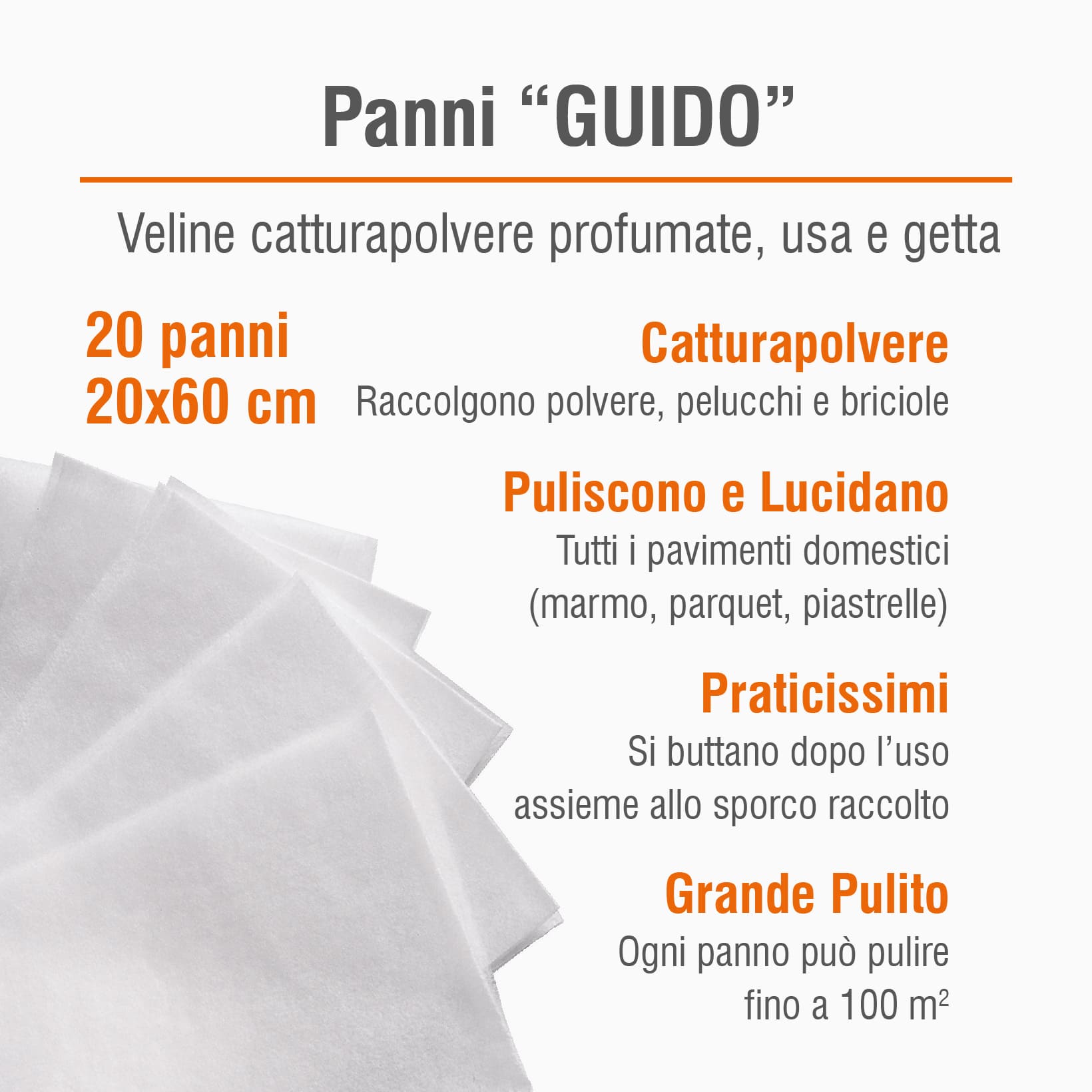 ULTERIORI AVVERTENZE PER PANNI RICAMBIO GUIDO: Il contatto con gli impregnanti del prodotto può provocare reazione allergica in soggetti sensibili. Si consiglia l’utilizzo di un guanto che garantisca protezione alle mani. Richiudere bene la confezione dopo l’uso per evitare che i panni si secchino.