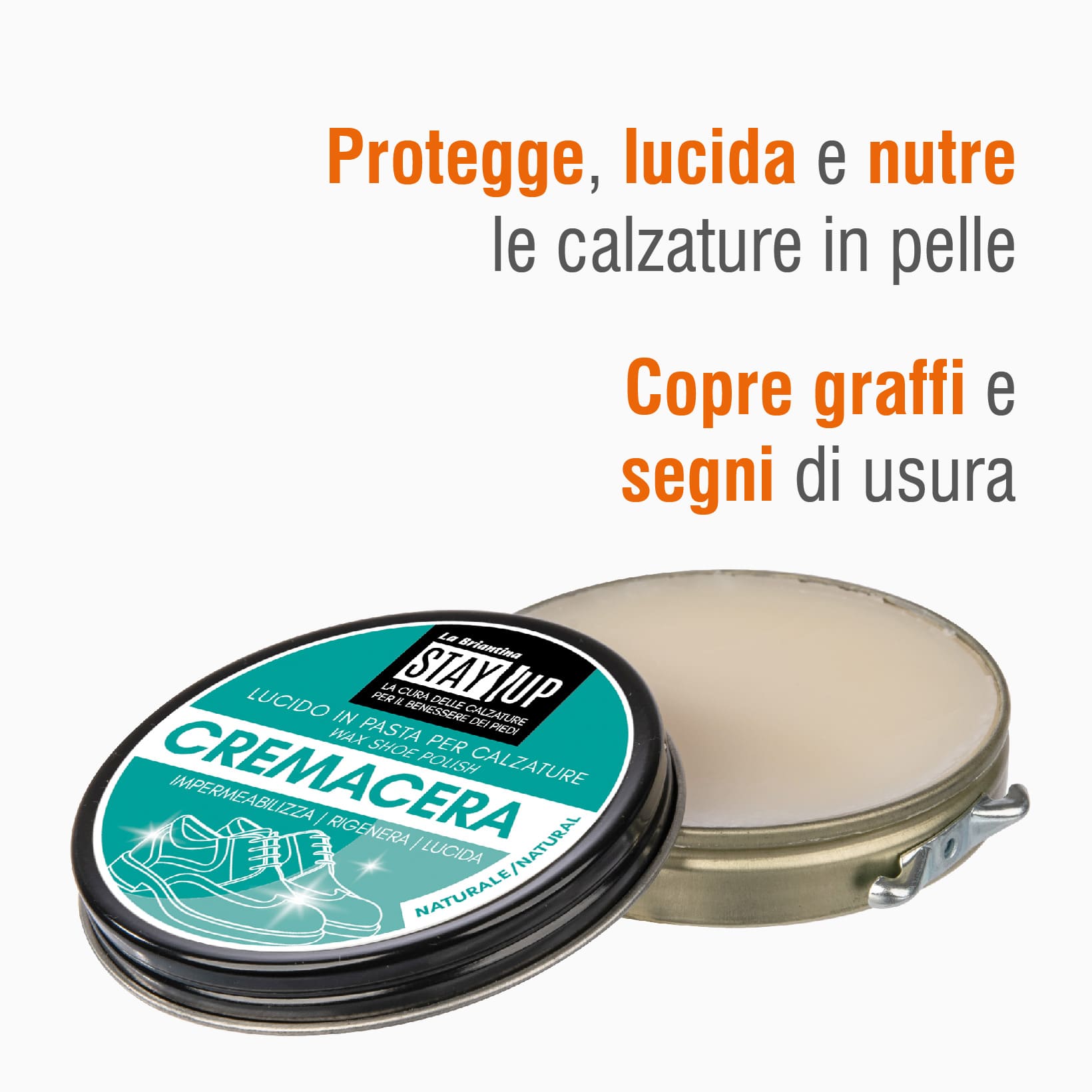 ULTERIORI AVVERTENZE PER LUCIDO CREMACERA E LUCIDO LIQUIDO NEUTRO PER CALZATURE: Prima di trattare pelli particolarmente delicate testare il prodotto su un’area nascosta. Tenere lontano dalla portata di animali e bambini. Non sfregare su occhi e pelle. Non utilizzare al di fuori delle modalità indicate. NON UTILIZZARE SU PELLE DIVERSA DAL COLORE INDICATO, CALZATURE IN CAMOSCIO, NABUK, VELLUTO, ALCANTARA, PELLI OPACHE E COTONE.