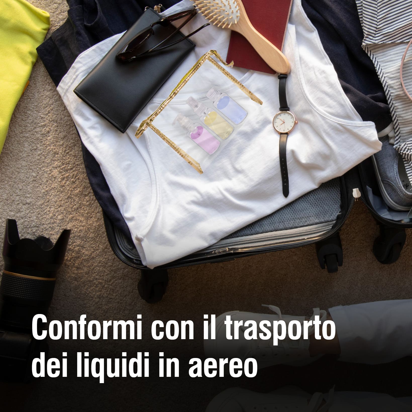ULTERIORI AVVERTENZE PER IL TRAVEL KIT BAGNO 3 PZ: Non adatti a contenere formule a base di alcool (inclusi profumi), smalti o solventi.