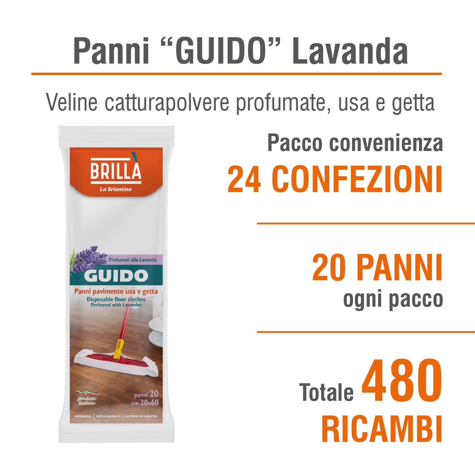 Rendi la pulizia dei pavimenti veloce e profumata con il Pacco Convenienza Veline Pavimento Guido alla Lavanda: i panni usa e getta, adatti per spazzoloni da 40 cm. I Panni alla lavanda Guido sono studiati per offrire una pulizia impeccabile e una piacevole profumazione che avvolge tutta la casa. Catturano con facilità polvere, peli, capelli e briciole da ogni tipo di pavimento, lasciando le superfici lucide, profumate e senza residui. Realizzati in polipropilene impregnato con olio minerale bianco e profumo fresco di lavanda, sono morbidissimi e ideali anche per superfici delicate come parquet e marmo. 🔹 Fresca profumazione di lavanda 🔹 Cattura polvere ed elimina lo sporco in un solo gesto 🔹 Delicato su tutti i pavimenti, anche quelli più sensibili FORMATO CONVENIENZA: per uso frequente o ambienti ampi 📦 Contenuto: 480 panni (24 confezioni da 20) 📏 Formato panno: 24 x 60 cm – Adatti per attrezzi da 40 cm 🧵 Composizione: 100% polipropilene con olio minerale bianco e profumazione sintetica AVVERTENZE: Tenere lontano dalla portata di animali e bambini. Non utilizzare per scopi diversi da quello indicato. Il contatto con gli impregnanti del prodotto può provocare reazione allergica in soggetti sensibili. Si consiglia l’utilizzo di un guanto che garantisca protezione alle mani. Richiudere bene la confezione dopo l’uso per evitare che i panni si secchino.