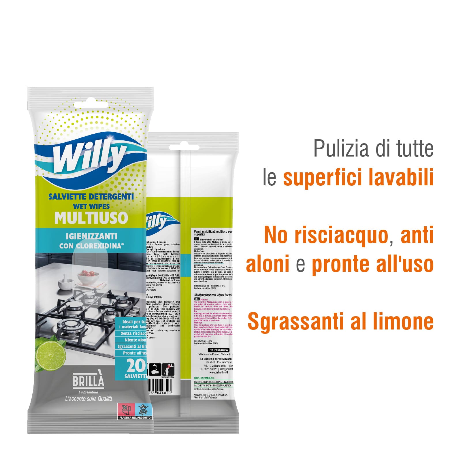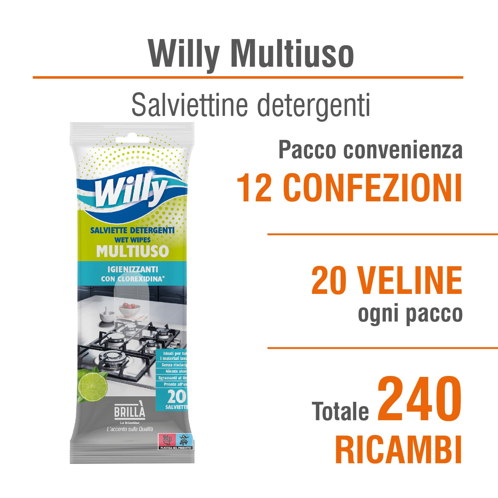 Pulisci, sgrassa e profuma con praticità le superfici lavabili di casa, con il Pacco Convenienza Veline Umidificate Willy Multiuso imbevute al Limone. I panni Willy multiuso sono la scelta pratica e veloce per la pulizia quotidiana di tutte le superfici lavabili della casa. Pronti all’uso, non richiedono risciacquo, non lasciano aloni e rilasciano un fresco profumo di limone.